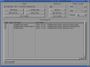MultiRename is a tool for renaming multiple input files and directories according to a user defined pattern. It is inspired by the MultiRename tool of TotalCommander (Windows), but does not yet have all of its functions.