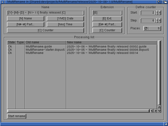 To run it an Amiga with AmigaOS 3.2.3 (!) is needed: MultiRename uses BOOPSI objects (Reaction) and needs a recently updated function of 'string.gadget' which was released in the 3.2.3 update in April 2025.
